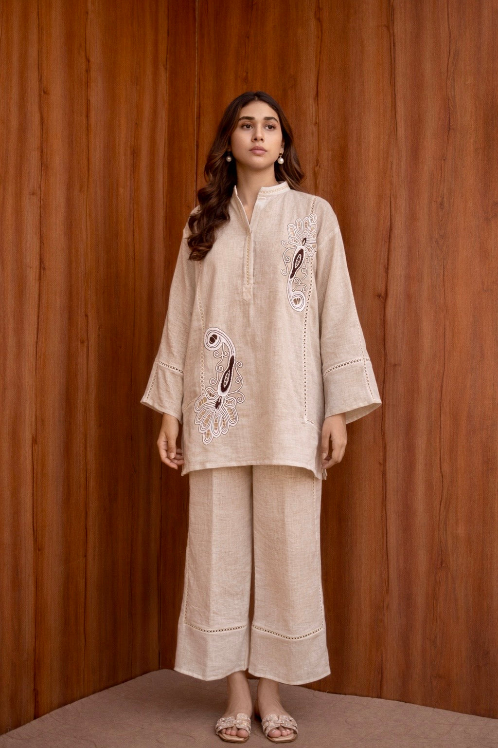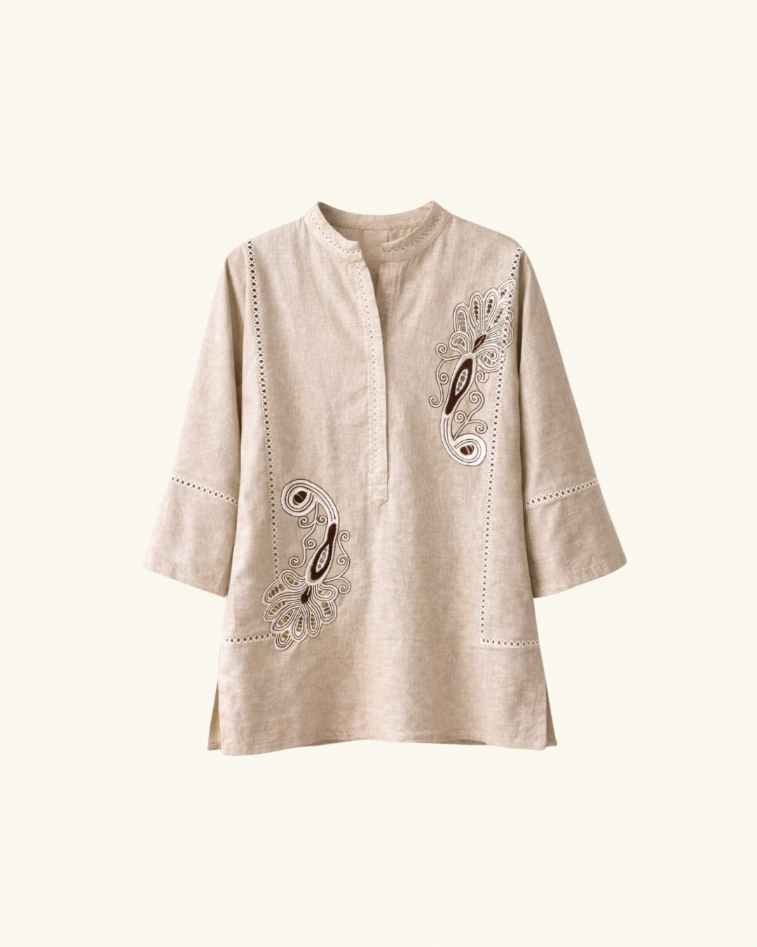 Premium linen with lacework for elevated everyday wear.